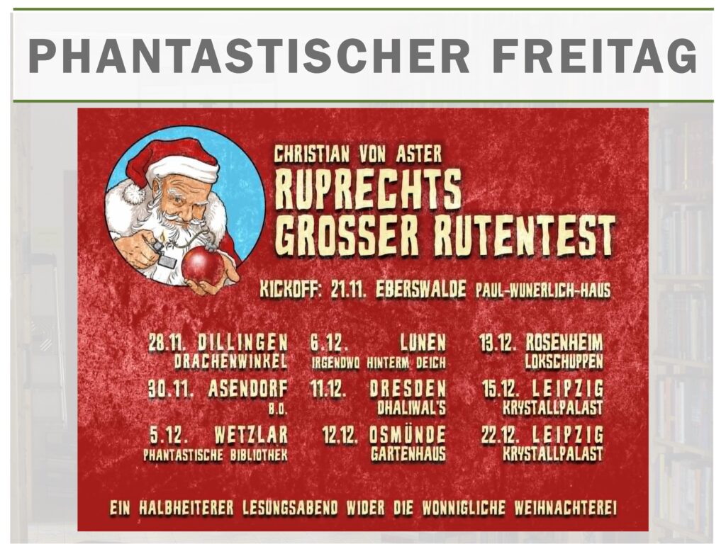 Zum Abschluss der monatlichen Freitagslesungen wird’s weihnachtlich: am Freitag, den 5. Dezember um 18.30 Uhr offeriert Christian von Aster zwischen vergnügter Festtagsfrotzelei und wirrwichteligem Wunschzettelmassaker neben […]